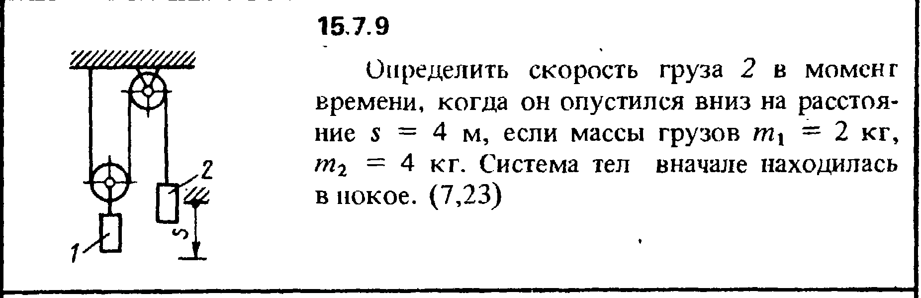 15.7.9. Определить скорость груза 2 в момент времени, когда он опустился вниз на расстоя­ние s = 4 м, если массы грузов m1 = 2 кг, m2 = 4 кг. Система тел вначале находилась в покое.
