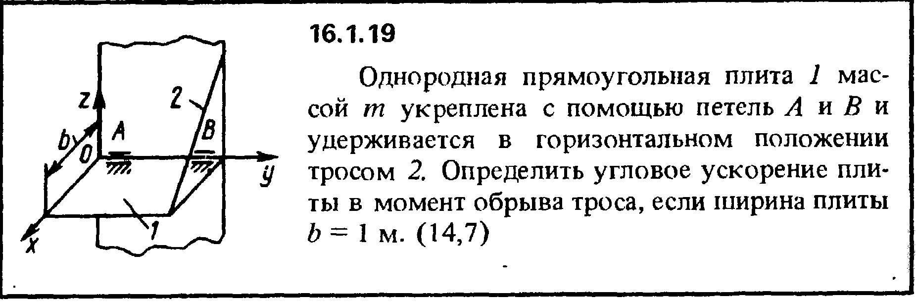16.1.19. Однородная прямоугольная плита 1 мас­сой m укреплена с помощью петель А и В и удерживается в горизонтальном положении тросом 2. Определить угловое ускорение пли­ты в момент обрыва троса, если ширина плиты b = 1 м.