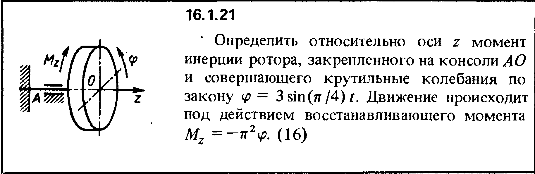 16.1.21. Определить относительно оси z момент инерции ротора, закрепленною на консоли АО и совершающего крутильные колебания по закону φ = 3sin(π/4)t. Движение происходит под действием восстанавливающего момента Mz = -π2φ.