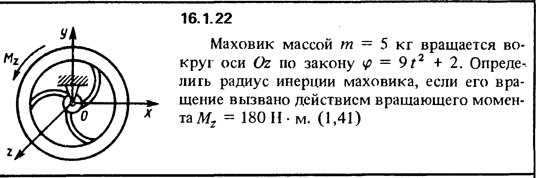 16.1.22. Маховик массой m = 5 кг вращается вокруг оси Oz по закону φ = 9t2 + 2. Опреде­лить радиус инерции маховика, если его вра­щение вызвано действием вращающего момен­та Мz = 180 H·м.