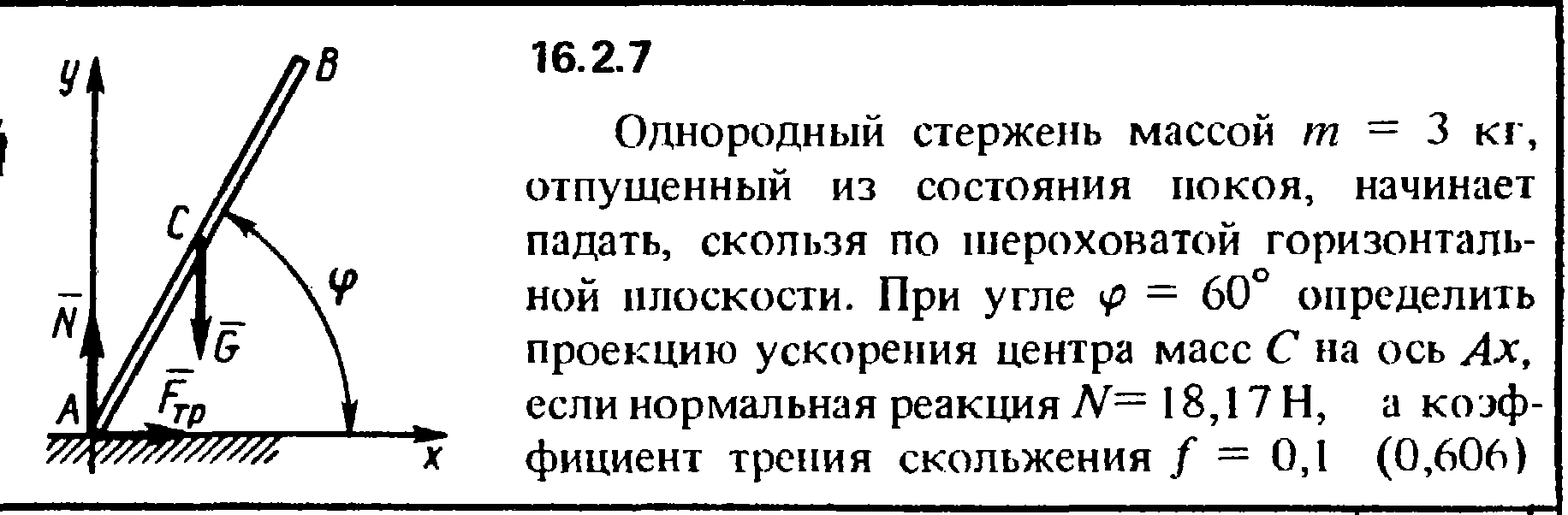 16.2.7. Однородный стержень массой m = 3 кг, отпущенный из состояния покоя, начинает падать, скользя по шероховатой горизонтальной плоскости. При угле φ = 60° определить проекцию ускорения центра масс С на ось Ах, если нормальная реакция N = 18,17 Н, а коэффициент трения скольжения f = 0,1.