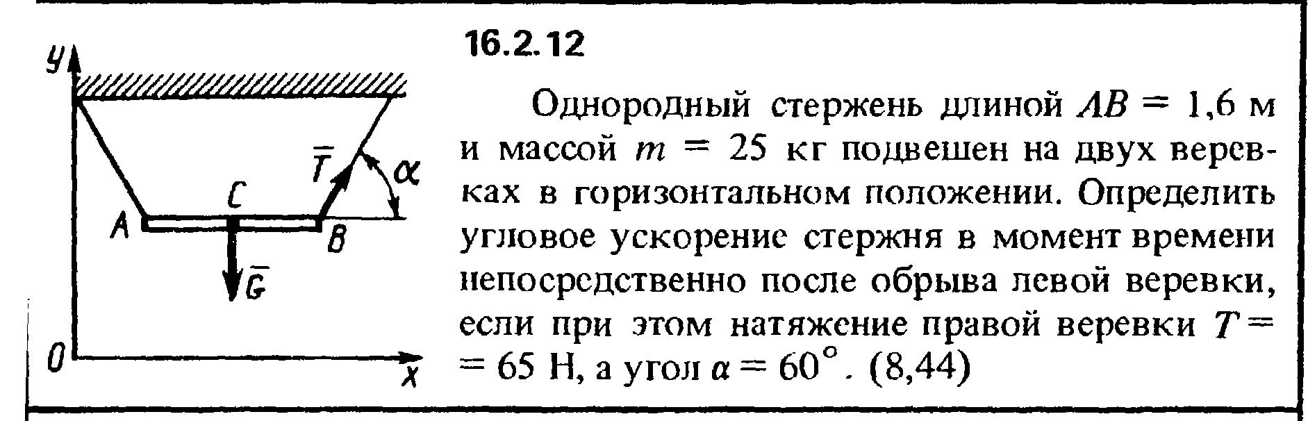 16.2.12. Однородный стержень длиной АВ = 1,6 м и массой m = 25 кг подвешен на двух веревках в горизонтальном положении. Определить угловое ускорение стержня в момент времени непосредственно после обрыва левой веревки, если при этом натяжение правой веревки Т = 65 Н, а угол α = 60°.