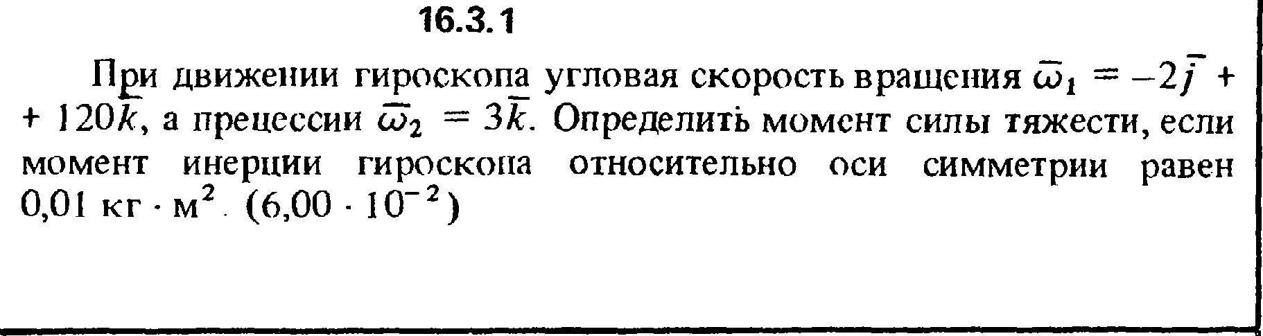 16.3.1. При движении гироскопа угловая скорость вращения ω1 = -2j + 120k, а прецессии ω2 = 3k. Определить момент силы тяжести, если момент инерции гироскопа относительно оси симметрии равен 0,01 кг·м2.