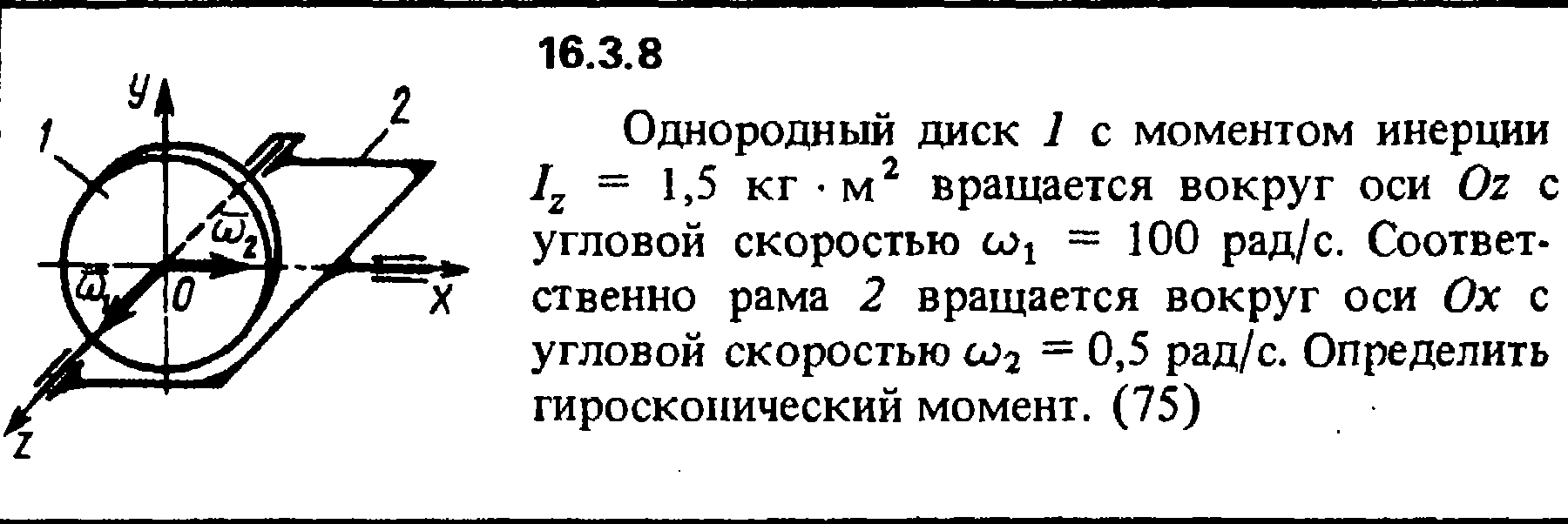 16.3.8. Однородный диск 1 с моментом инерции Iz = 1,5 кг·м2 вращается вокруг оси Oz с угловой скоростью ω1 = 100 рад/с. Соответ­ственно рама 2 вращается вокруг оси Ох с угловой скоростью ω2 = 0,5 рад/с. Определить гироскопический момент.