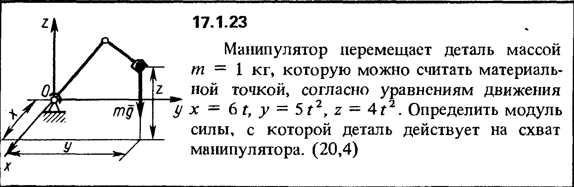 17.1.23. Манипулятор перемещает деталь массой m = 1 кг, которую можно считать материаль­ной точкой, согласно уравнениям движения х = 6t, у = 5t2, z = 4t2. Определить модуль силы, с которой деталь действует на схват манипулятора.