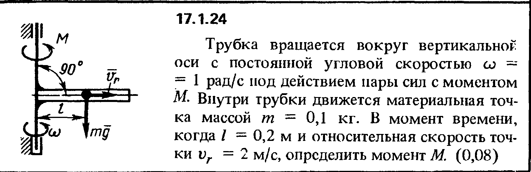 17.1.24. Трубка вращается вокруг вертикальной оси с постоянной угловой скоростью ω = 1 рад/с под действием пары сил с моментом М. Внутри трубки движется материальная точ­ка массой m = 0,1 кг. В момент времени, когда t = 0,2 м и относительная скорость точ­ки vr = 2 м/с, определить момент М.