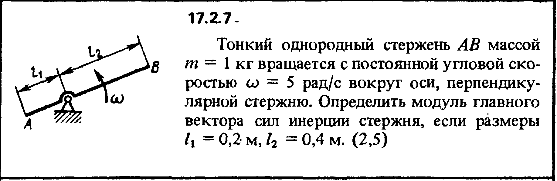 17.2.7. Тонкий однородный стержень АВ массой m = 1 кг вращается с постоянной угловой ско­ростью ω = 5 рад/с вокруг оси, перпендику­лярной стержню. Определить модуль главного вектора сил инерции стержня, если размеры l1 = 0,2 м, l2 = 0,4 м.