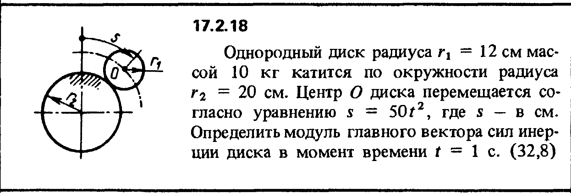 17.2.18. Однородный диск радиуса r1 = 12 см мас­сой 10 кг катится по окружности радиуса r2 = 20 см. Центр О диска перемещается согласно уравнению s = 50t2, где s - в см. Определить модуль главного вектора сил инер­ции диска в момент времени t = 1 с.