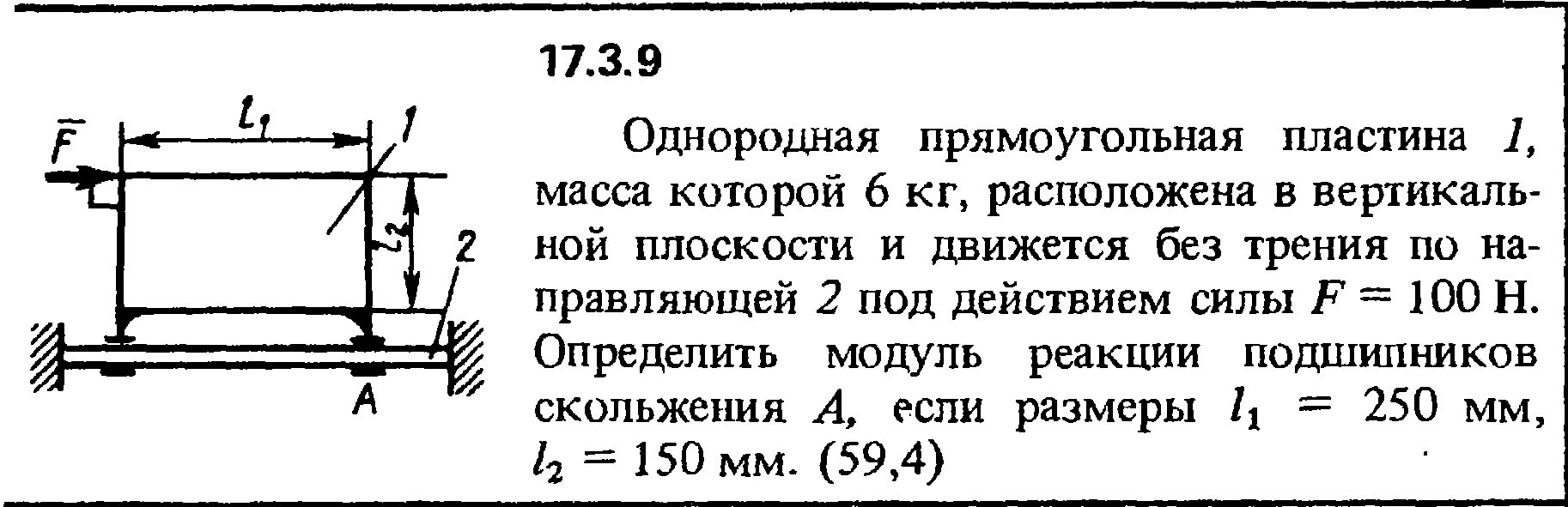 17.3.9. Однородная прямоугольная пластина 1, масса которой 6 кг, расположена в вертикаль­ной плоскости и движется без трения по на­правляющей 2 под действием силы F = 100 Н. Определить модуль реакции подшипников скольжения А, если размеры l1 = 250 мм, l2 = 150 мм.