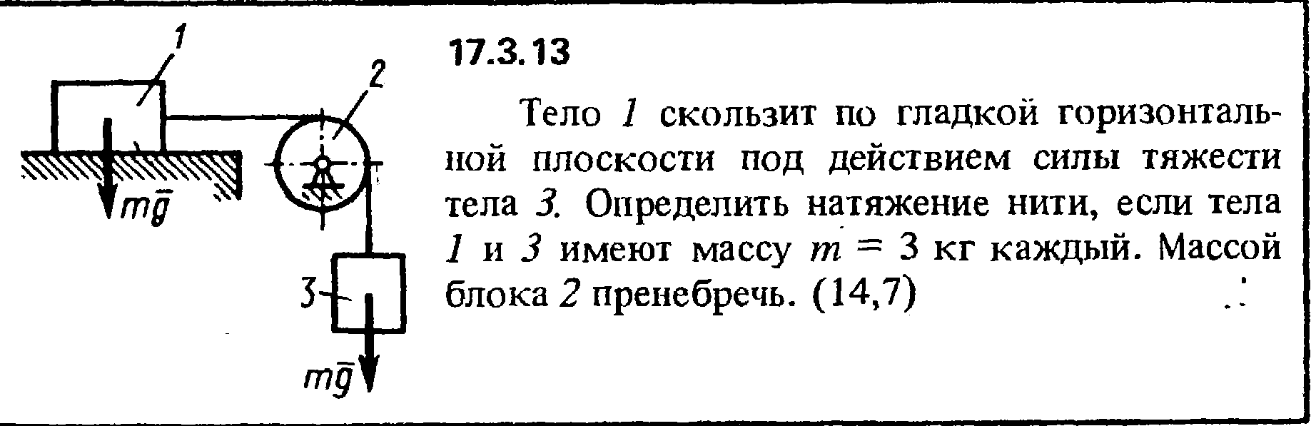 17.3.13. Тело 1 скользит по гладкой горизонталь­ной плоскости под действием силы тяжести тела 3. Определить натяжение нити, если тела 1 и 3 имеют массу m = 3 кг каждый. Массой блока 2 пренебречь.