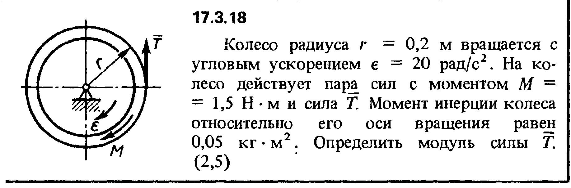 17.3.18. Колесо радиуса r = 0,2 м вращается с угловым ускорением ε = 20 рад/с2. На ко­лесо действует пара сил с моментом М = 1,5 Н·м и сила Т. Момент инерции колеса относительно его оси вращения равен 0,05 кг·м2. Определить модуль силы Т.