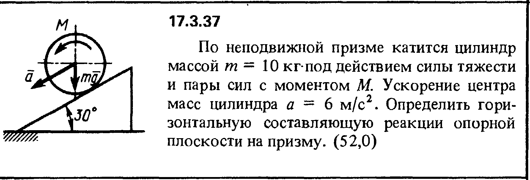 17.3.37. По неподвижной призме катится цилиндр массой m = 10 кг под действием силы тяжести и пары сил с моментом М. Ускорение центра масс цилиндра а = 6 м/с2. Определить гори­зонтальную составляющую реакции опорной плоскости на призму.