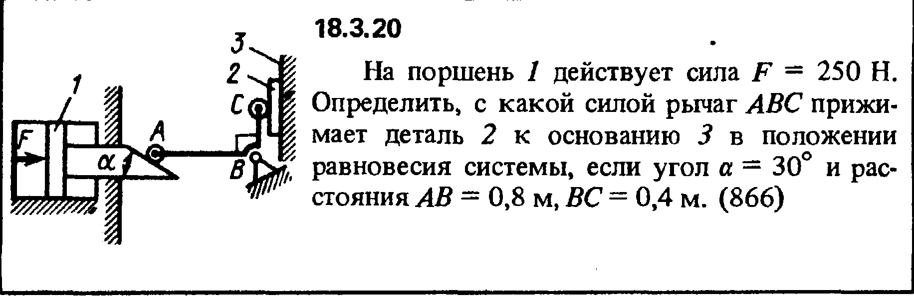 18.3.20. На поршень 1 действует сила F = 250 Н. Определить, с какой силой рычаг ABC прижи­мает деталь 2 к основанию 3 в положении равновесия системы, если угол α = 30° и рас­стояния АВ = 0,8 м, ВС = 0,4 м.