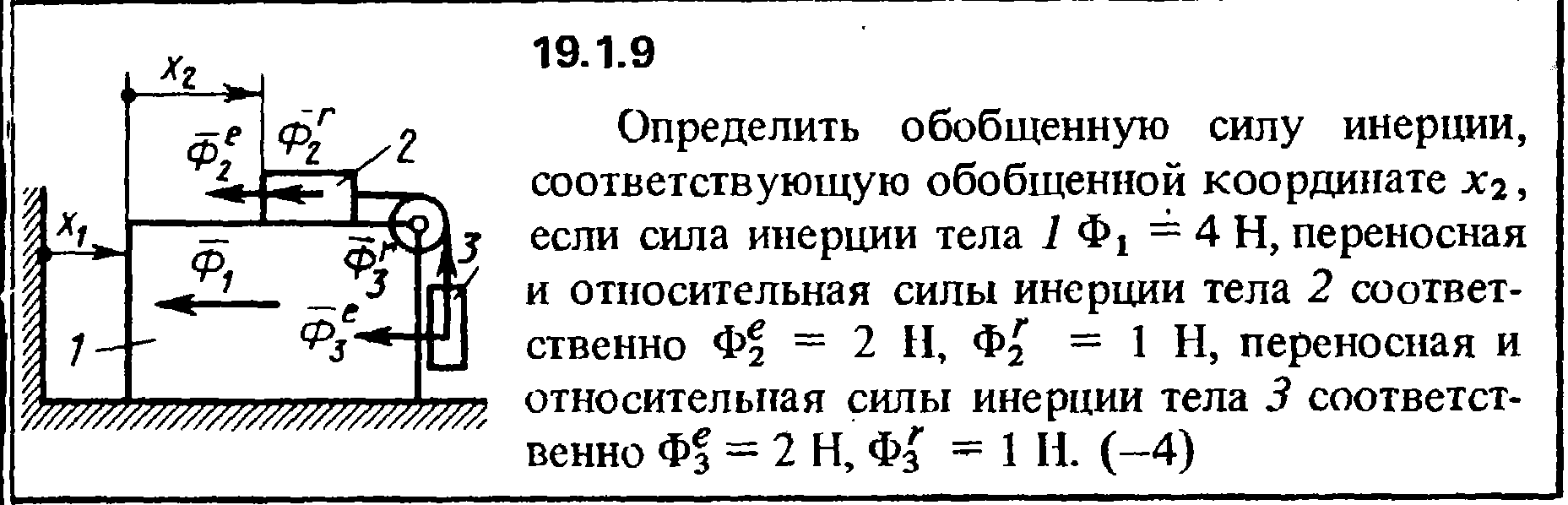 19.1.9. Определить обобщенную силу инерции, соответствующую обобщенной координате х2, если сила инерции тела 1 Ф1 = 4 Н, переносная и относительная силы инерции тела 2 соответственно Ф2e = 2 Н, Ф2r = 1 Н, переносная и относительная силы инерции тела 3 соответственно Ф3е = 2 Н, Ф3r = 1 Н.