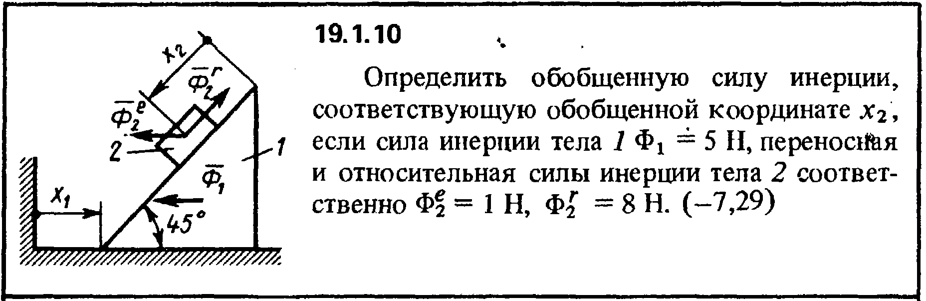 19.1.10. Определить обобщенную силу инерции, соответствующую обобщенной координате х2, если сила инерции тела 1 Ф1 = 5 Н, переносная и относительная силы инерции тела 2 соответ­ственно Ф2e = 1 Н, Ф2r = 8 Н.