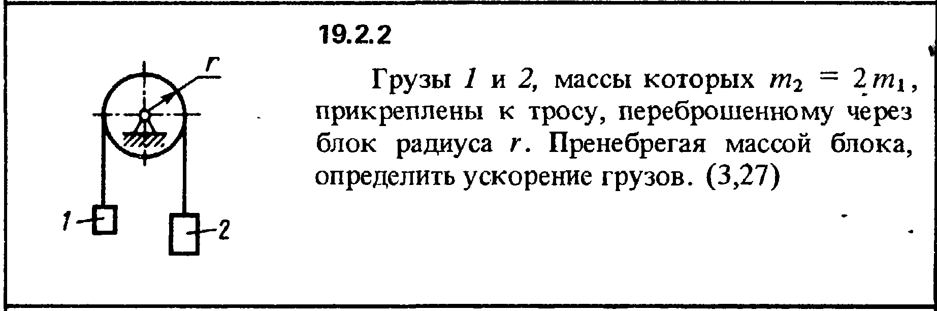 19.2.2. Грузы 1 и 2, массы которых m2 = 2m1, прикреплены к тросу, переброшенному через блок радиуса r. Пренебрегая массой блока, определить ускорение грузов.