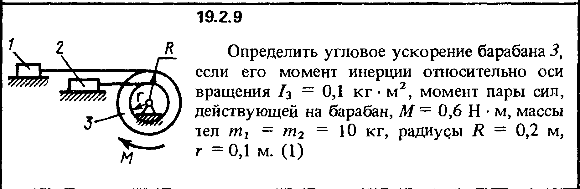 19.2.9. Определить угловое ускорение барабана если его момент инерции относительно оси вращения I3 = 0,1 кг·м , момент пары сил, действующей на барабан, М = 0,6 Н·м, массы тел m1 = m2 = 10 кг, радиусы R = 0,2 м, r = 0,1 м.
