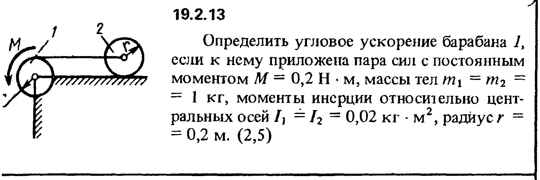 19.2.13. Определить угловое ускорение барабана 1, если к нему приложена пара сил с постоянным моментом М = 0,2 Н·м, массы тел m1 = m2 = 1 кг, моменты инерции относительно цент­ральных осей I1 = I2 = 0,02 кг·м2, радиус r = 0,2 м.