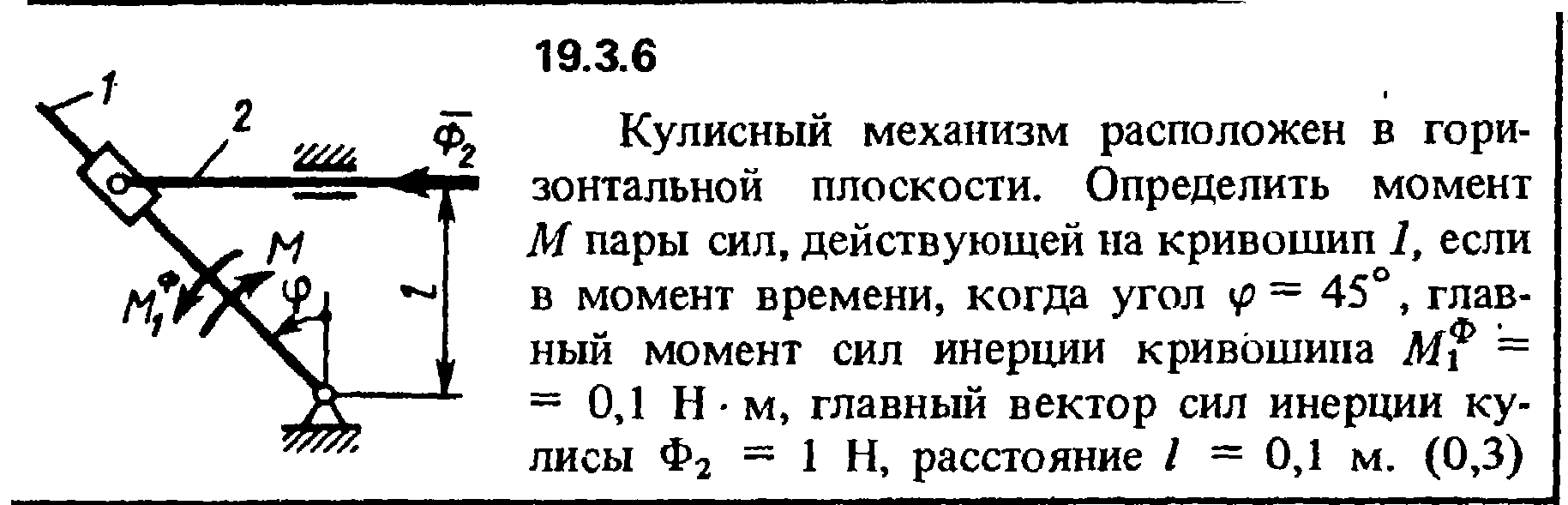 19.3.6. Кулисный механизм расположен в гори­зонтальной плоскости. Определить момент М пары сил, действующей на кривошип 1, если в момент времени, когда угол φ = 45°, глав­ный момент сил инерции кривошипа М1Ф = 0,1 Н·м, главный вектор сил инерции ку­лисы Ф2 = 1 Н, расстояние l = 0,1 м.
