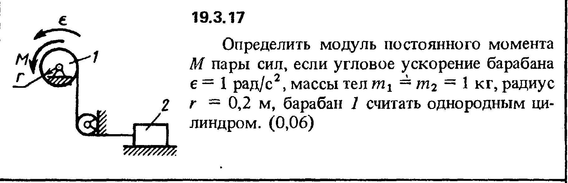 19.3.17. Определить модуль постоянного момента М пары сил, если угловое ускорение барабана ε = 1 рад/с2, массы тел m1 = m2 = 1 кг, радиус r = 0,2 м, барабан 1 считать однородным ци­линдром.