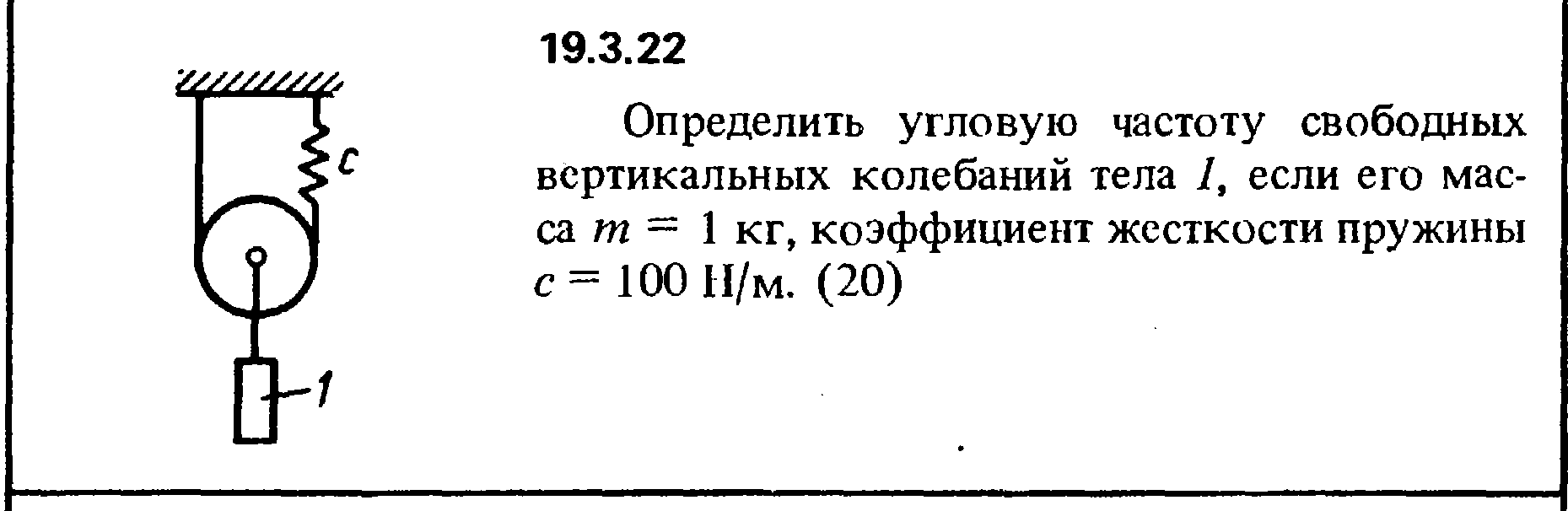 19.3.22. Определить угловую частоту свободных вертикальных колебаний тела 1, если его мас­са m = 1 кг, коэффициент жесткости пружины с = 100 H/м.