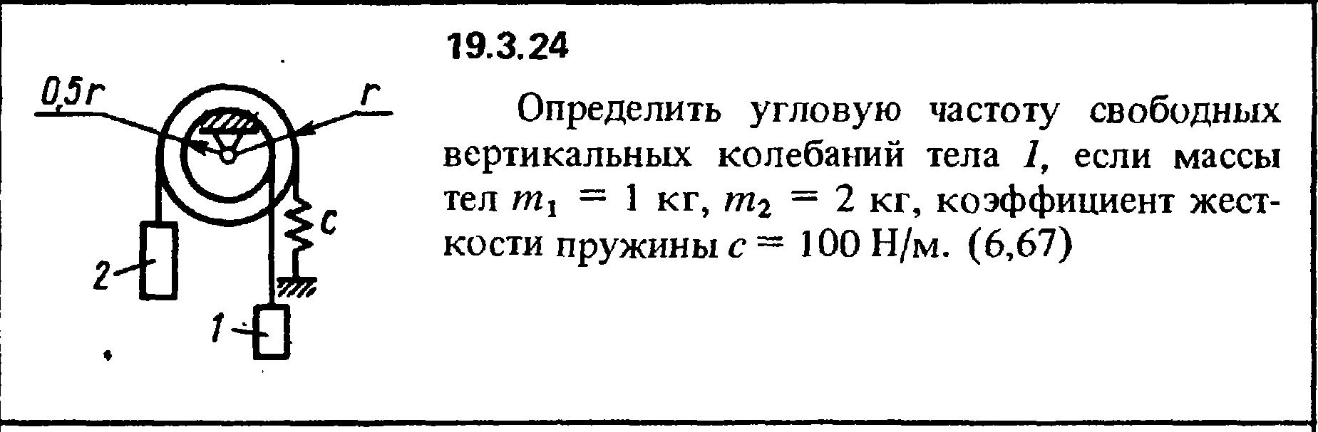 19.3.24. Определить угловую частоту свободных вертикальных колебаний тела 1, если массы тел m1 = 1 кг, m2 = 2 кг, коэффициент жест­кости пружины с = 100 Н/м.
