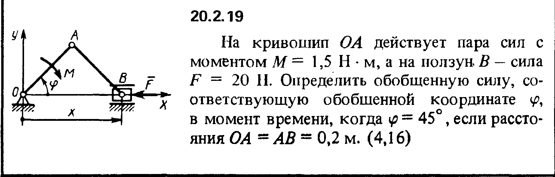 20.2.19. На кривошип ОА действует пара сил с моментом М = 1,5 Н·м, а на ползун В - сила F = 20 Н. Определить обобщенную силу, со­ответствующую обобщенной координате в момент времени, когда φ = 45°, если рассто­яния ОА = АВ = 0,2 м.