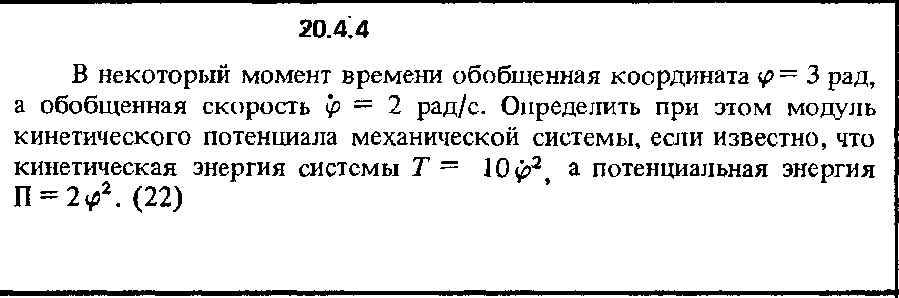 20.4.4. В некоторый момент времени обобщенная координата φ = 3 рад, а обобщенная скорость φ = 2 рад/с. Определить при этом модуль кинетического потенциала механической системы, если известно, что кинетическая энергия системы Т = 10φ2, а потенциальная энергия П = 2φ2.