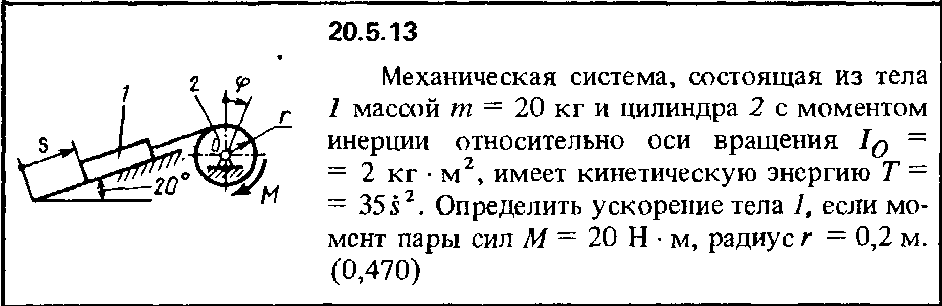 20.5.13. Механическая система, состоящая из тела 1 массой m = 20 кг и цилиндра 2 с моментом инерции относительно оси вращения IO = 2 кг·м2, имеет кинетическую энергию Т = 35s2. Определить ускорение тела 1, если мо­мент пары сил М = 20 Н·м, радиус r = 0,2 м.
