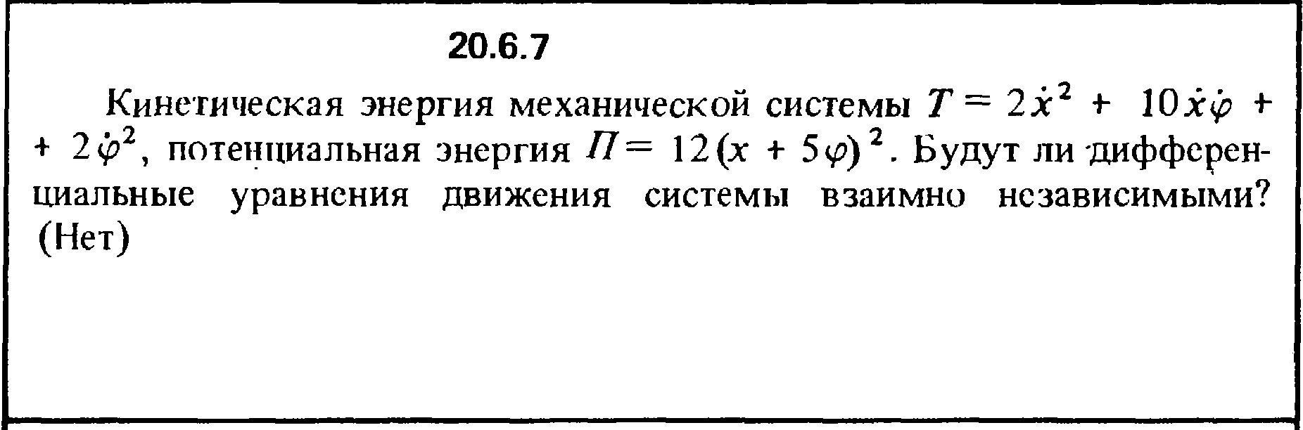 20.6.7. Кинетическая энергия механической системы Т = 2х2 + 10хφ + 2φ2, потенциальная энергия П = 12(х + 5φ)2. Будут ли дифферен­циальные уравнения движения системы взаимно независимыми?