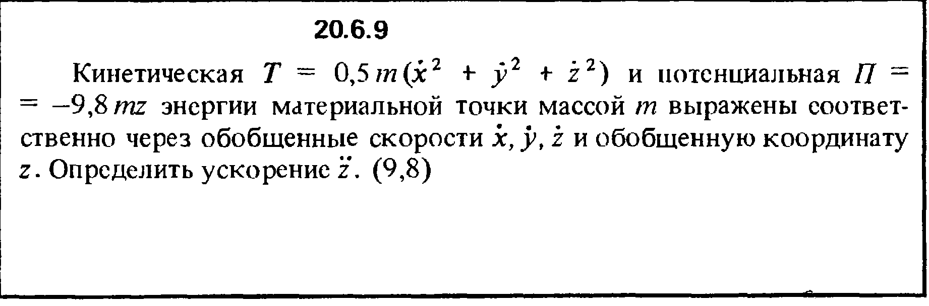 20.6.9. Кинетическая Т = 0,5m(х2 + у2 + z2) и потенциальная П = -9,8mz энергии материальной точки массой m выражены соответ­ственно через обобщенные скорости х, у, z и обобщенную координату z. Определить ускорение z.
