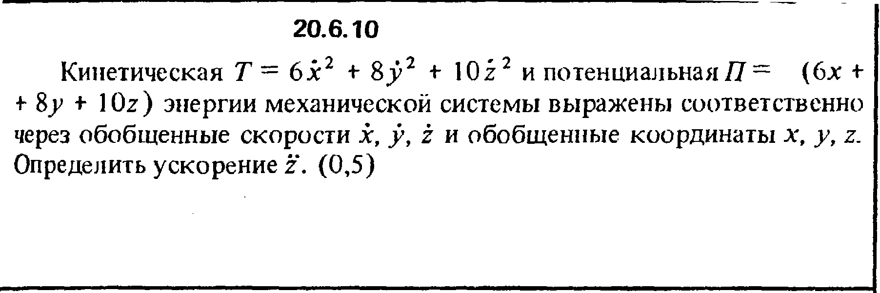 20.6.10. Кинетическая Т = 6х2 + 8у2 + 10z2 и потенциальная П = -(6х + 8y + 10z) энергии механической системы выражены соответственно через обобщенные скорости х, у, z и обобщенные координаты x, z. Определить ускорение z.