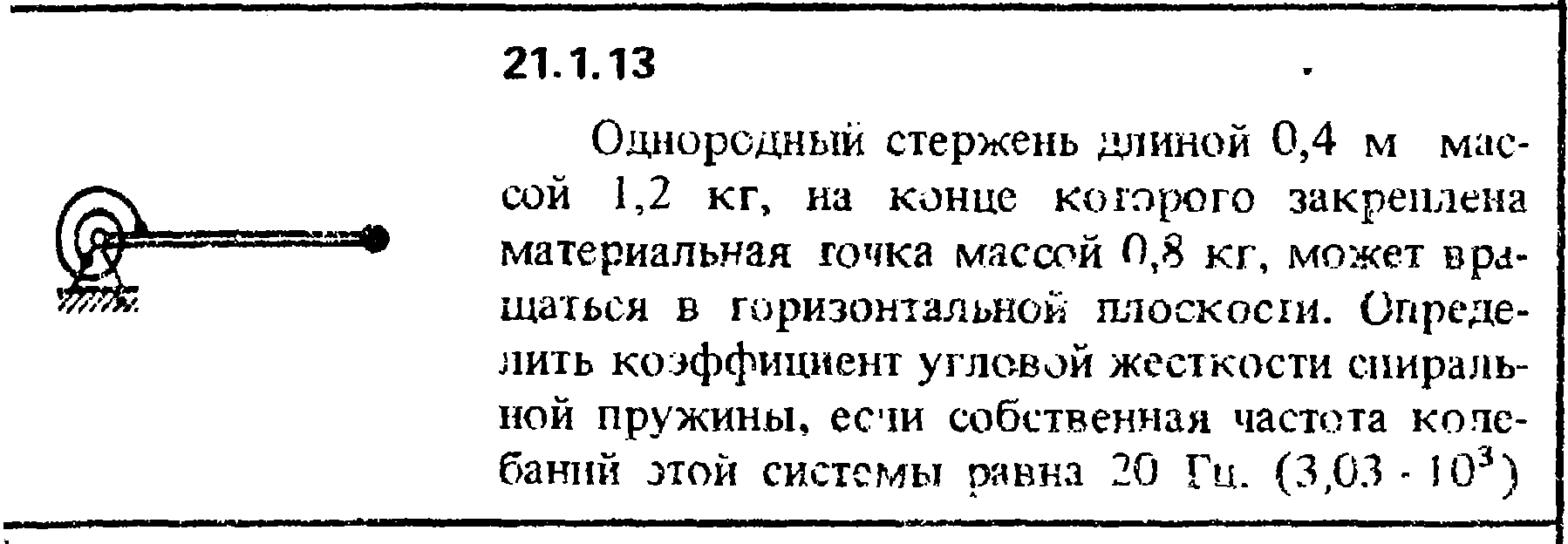 21.1.13. Однородный стержень длиной 0,4 м мас­сой 1,2 кг, на конце которого закреплена материальная точка массой 0,8 кг, может вра­щаться в горизонтальной плоскости. Опреде­лить коэффициент угловой жесткости спираль­ной пружины, если собственная частота колебаннй этой системы равна 20 Гц.