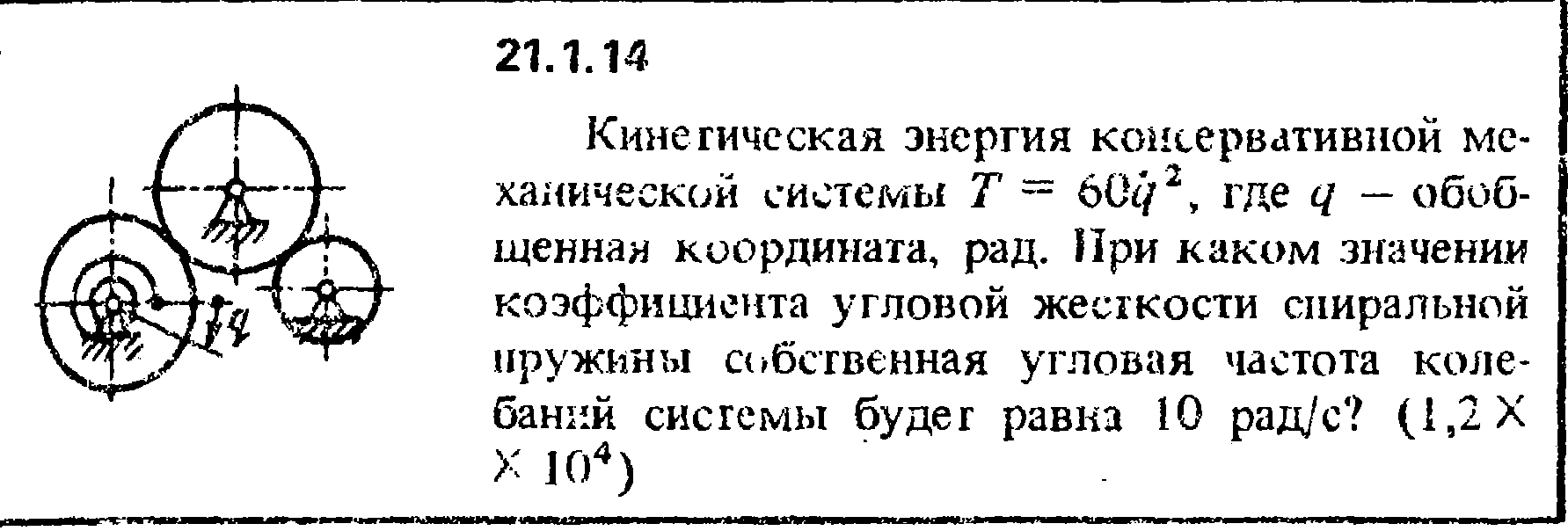 21.1.14. Кинетическая энергия консервативной ме­ханической системы Т = 60q2, где q - обоб­щенная координата, рад. При каком значении коэффициента угловой жесткости спиральной пружины собственная угловая частота коле­баний системы будет равна 10 рад/с?