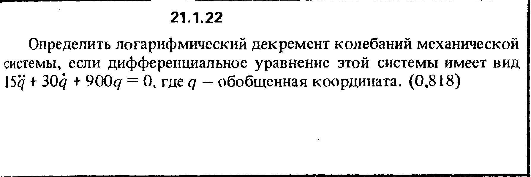 21.1.22. Определить логарифмический декремент колебаний механической системы, если дифференциальное уравнение этой системы имеет вид 15q + 30q + 900q = 0. где q - обобщенная координата.