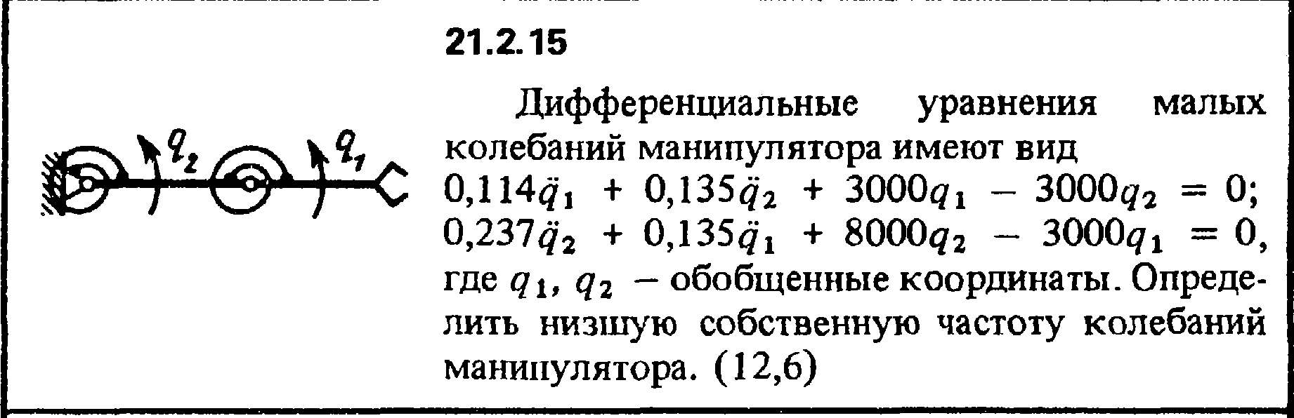 21.2.15. Дифференциальные уравнения малых колебаний манипулятора имеют вид 0,114q1 + 0,135q2 + 3000q1 - 3000q2 = 0; 0,237q2 + 0,135q1 + 8000q2 - 3000q1 = 0, где q1, q2 - обобщенные координаты. Опреде­лить низшую собственную частоту колебаний манипулятора.