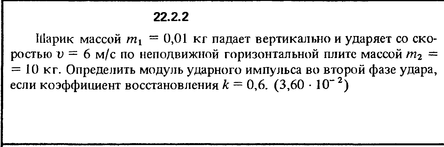 22.2.2. Шарик массой m1 = 0,01 кг падает вертикально и ударяет со ско­ростью v = 6 м/с по неподвижной горизонтальной плите массой m2 = 10 кг. Определить модуль ударного импульса во второй фазе удара, если коэффициент восстановления k = 0,6.