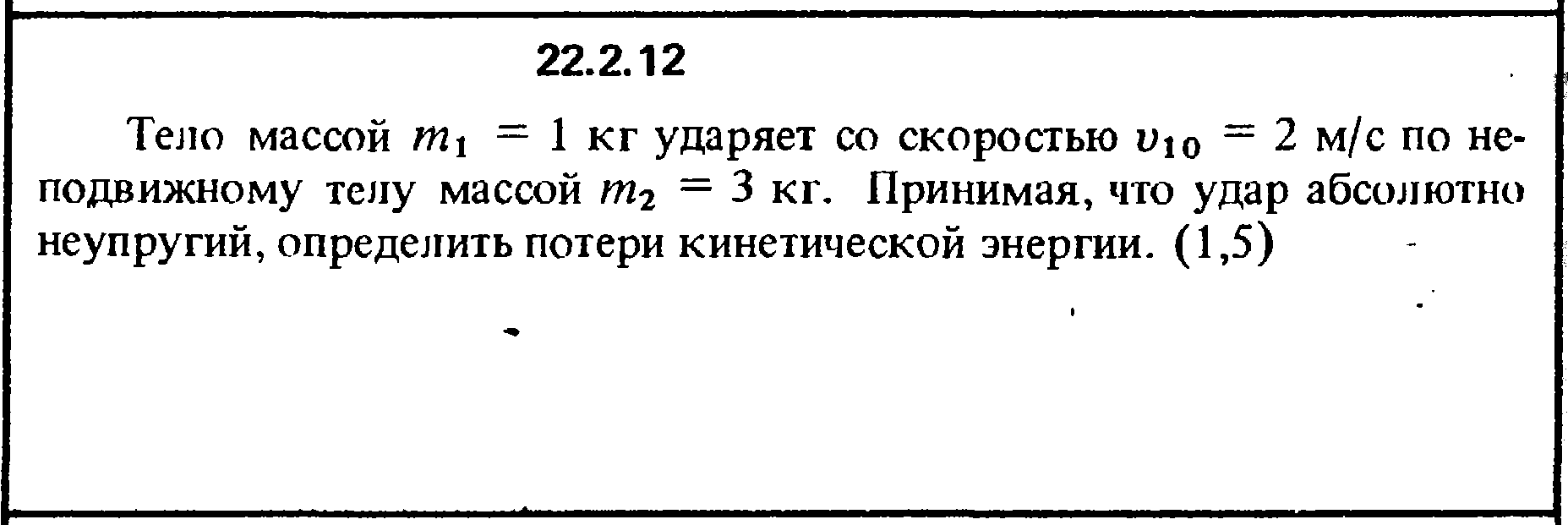 22.2.12. Тело массой m1 = 1 кг ударяет со скоростью v10 = 2 м/с по не­подвижному телу массой m2 = 3 кг. Принимая, что удар абсолютно неупругий, определить потери кинетической энергии.