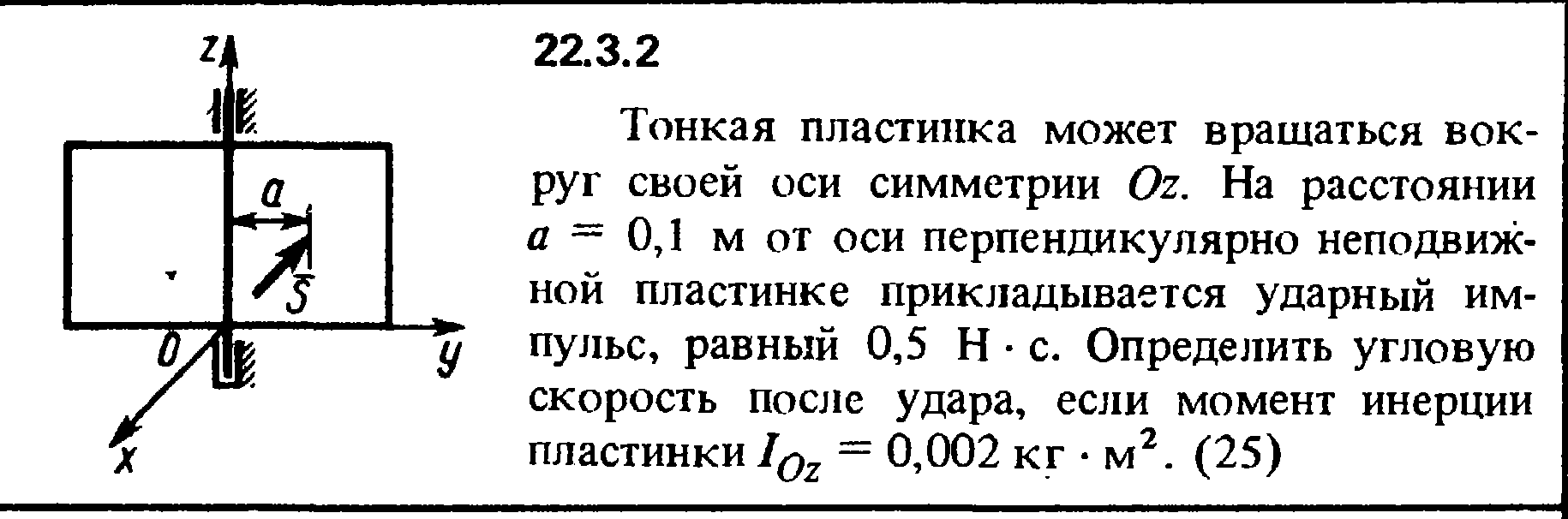22.3.2. Тонкая пластинка может вращаться вокруг своей оси симметрии Oz. На расстоянии а = 0,1 м от оси перпендикулярно неподвижной пластинке прикладывается ударный импульс, равный 0,5 Н·с. Определить угловую скорость после удара, если момент инерции пластинки IOz = 0,002 кг·м2.