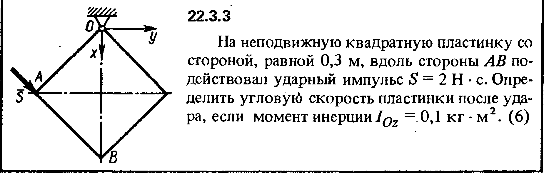 22.3.3. The thin plate can be rotated around its axis of symmetry Oz. At a distance of a = 0.1 m shock pulse is applied to the axis perpendicular to the fixed plate of 0.5 N · s. Determine the angular velocity after the impact, if the moment of inertia of the plate IOz = 0.002 kg · m2.