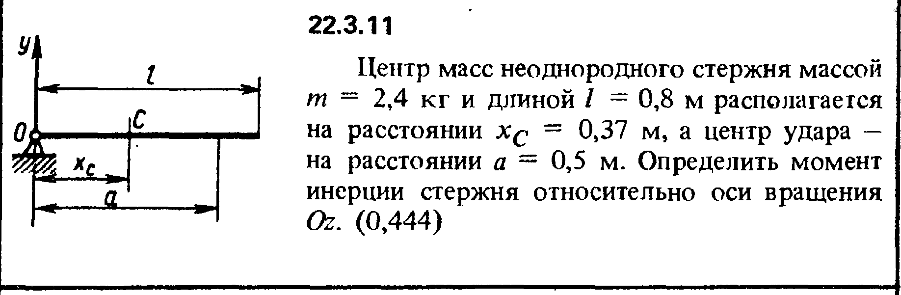 22.3.11. Центр масс неоднородного стержня массой m = 2,4 кг и длиной l = 0,8 м располагается на расстоянии хс = 0,37 м, а центр удара -на расстоянии а = 0,5 м. Определить момент инерции стержня относительно оси вращения Oz. (0,444)