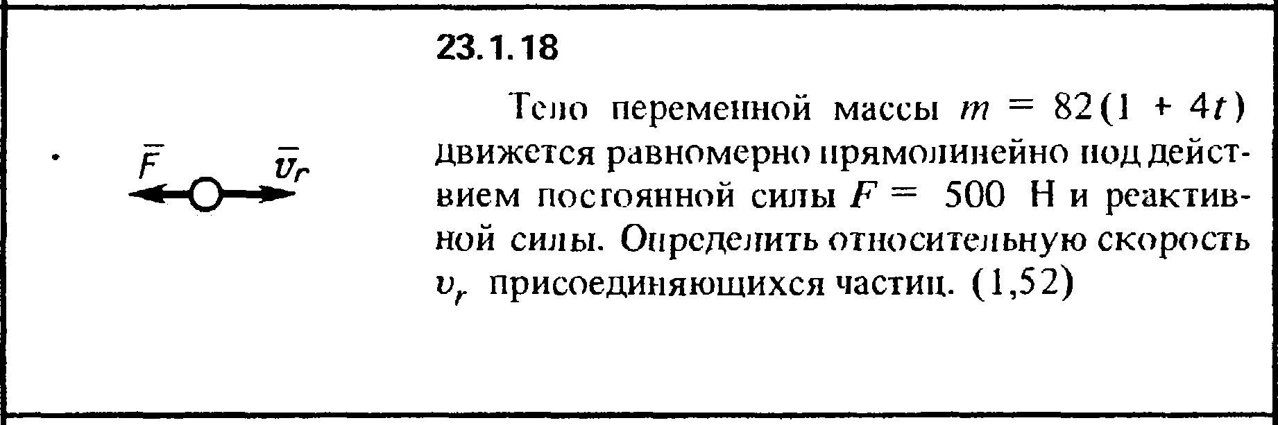 23.1.18. Тело переменной массы m = 82(1 + 4t) движется равномерно прямолинейно под действием постоянной силы F = 500 Н и реактивной силы. Определить относительную скорость vr присоединяющихся частиц. (1,52)