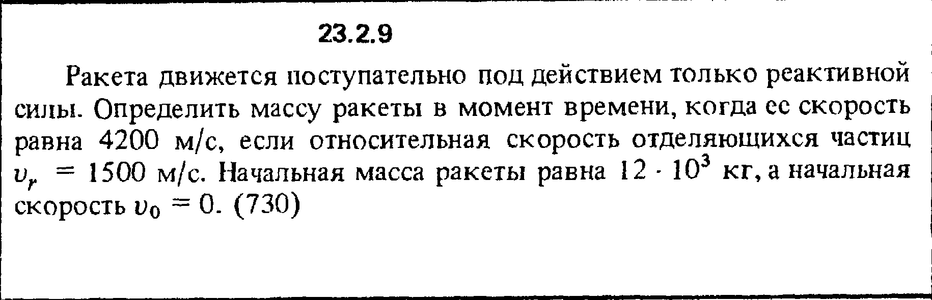 23.2.9. Ракета движется поступательно под действием только реактивной силы. Определить массу ракеты в момент времени, когда ее скорость равна 4200 м/с, если относительная скорость отделяющихся частиц vr =1500 м/с. Начальная масса ракеты равна 12 * 103 кг, а начальная скорость V0 = 0. (730)