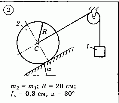Для приведенных на схемах 1-30 механических систем, используя теорему об изменении кинетической энергии в дифференциальной форме, определить угловое ускорение (варианты 4, 6, 7, 9, 11, 18, 25, 26, 28) или линейное ускорение (остальные варианты) тела 1. Нити невесомы и нерастяжимы. Принятые обозначения: т — массы тел, R и r — радиусы, р — радиус инерции (если он не указан, тело считать однородным цилиндром); при наличии трения указываются f — коэффициент трения скольжения, fк — коэффициент трения качения.