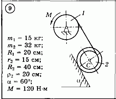 Для приведенных на схемах 1-30 механических систем, используя теорему об изменении кинетической энергии в дифференциальной форме, определить угловое ускорение (варианты 4, 6, 7, 9, 11, 18, 25, 26, 28) или линейное ускорение (остальные варианты) тела 1. Нити невесомы и нерастяжимы. Принятые обозначения: т — массы тел, R и r — радиусы, р — радиус инерции (если он не указан, тело считать однородным цилиндром); при наличии трения указываются f — коэффициент трения скольжения, fк — коэффициент трения качения.