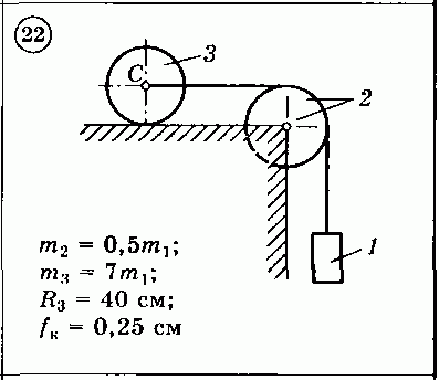Для приведенных на схемах 1-30 механических систем, используя теорему об изменении кинетической энергии в дифференциальной форме, определить угловое ускорение (варианты 4, 6, 7, 9, 11, 18, 25, 26, 28) или линейное ускорение (остальные варианты) тела 1. Нити невесомы и нерастяжимы. Принятые обозначения: т — массы тел, R и r — радиусы, р — радиус инерции (если он не указан, тело считать однородным цилиндром); при наличии трения указываются f — коэффициент трения скольжения, fк — коэффициент трения качения.