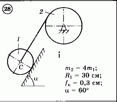 Для приведенных на схемах 1-30 механических систем, используя теорему об изменении кинетической энергии в дифференциальной форме, определить угловое ускорение (варианты 4, 6, 7, 9, 11, 18, 25, 26, 28) или линейное ускорение (остальные варианты) тела 1. Нити невесомы и нерастяжимы. Принятые обозначения: т — массы тел, R и r — радиусы, р — радиус инерции (если он не указан, тело считать однородным цилиндром); при наличии трения указываются f — коэффициент трения скольжения, fк — коэффициент трения качения.