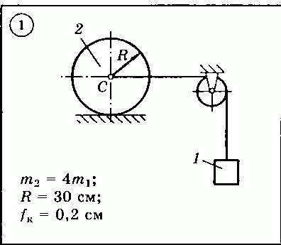 Для приведенных на схемах 1-30 механических систем, используя теорему об изменении кинетической энергии в интегральной форме, определить угловую скорость (варианты 4, 6, 7, 9, 11, 18, 25, 26, 28) или линейную скорость (остальные варианты) тела 1 после его заданного перемещения Фи1 = 2пи рад или S1 = 2 м. Движение начинается из состояния покоя.