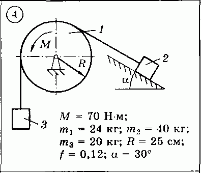 Для приведенных на схемах 1-30 механических систем, используя теорему об изменении кинетической энергии в интегральной форме, определить угловую скорость (варианты 4, 6, 7, 9, 11, 18, 25, 26, 28) или линейную скорость (остальные варианты) тела 1 после его заданного перемещения Фи1 = 2пи рад или S1 = 2 м. Движение начинается из состояния покоя.