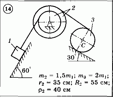 Для приведенных на схемах 1-30 механических систем, используя теорему об изменении кинетической энергии в интегральной форме, определить угловую скорость (варианты 4, 6, 7, 9, 11, 18, 25, 26, 28) или линейную скорость (остальные варианты) тела 1 после его заданного перемещения Фи1 = 2пи рад или S1 = 2 м. Движение начинается из состояния покоя.